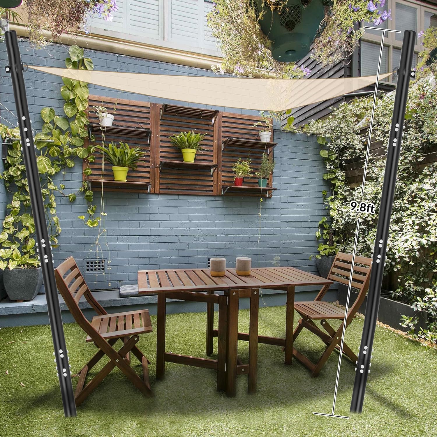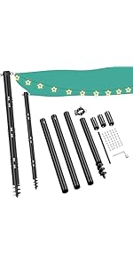 These awning poles can be installed on soft ground such as garden grass to support square, rectangular, triangular shade sails, hanging string lights, canopies, tarps, tents, or signposts.