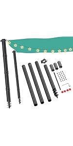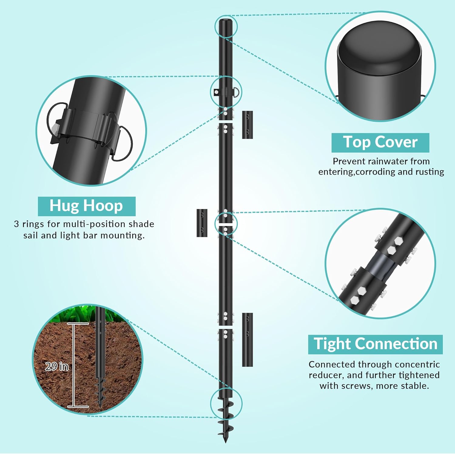 Sunshade sail pole adopts a unique spiral ground structure. Inserted deeper into the ground and is more stable. (Recommended depth when installing the base pole to the ground is 29 inch)